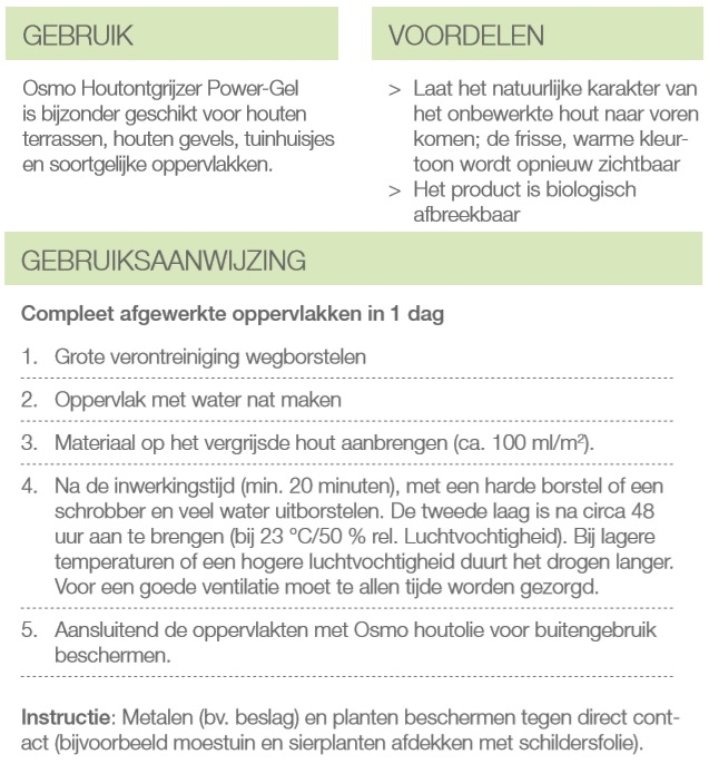 Na behandeling met de Power-Gel raden wij aan om het hout weer te beschermen door het oppervlak te behandelen met de Terras Olie.