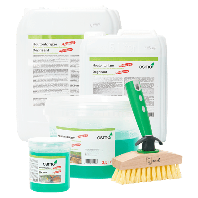 Osmo Power-Gel Houtontgrijzer is een vloeibare speciaalreiniger voor buiten, in het bijzonder geschikt voor het reinigen en ontgrijzen van steigers, houten vlonders en terrassen, houten gevels, tuinhuizen en soorgelijke oppervlakken. Ook geschikt voor het schoonmaken van houten tuinmeubelen! Door de krachtige werking van de Gel, wordt de grijze laag verwijderd en na het aanbrengen van een nieuw Osmo buiten product wordt de warme kleur van het hout hersteld. Osmo Power Gel Ontgrijzer is geurloos en biologisch afbreekbaar.